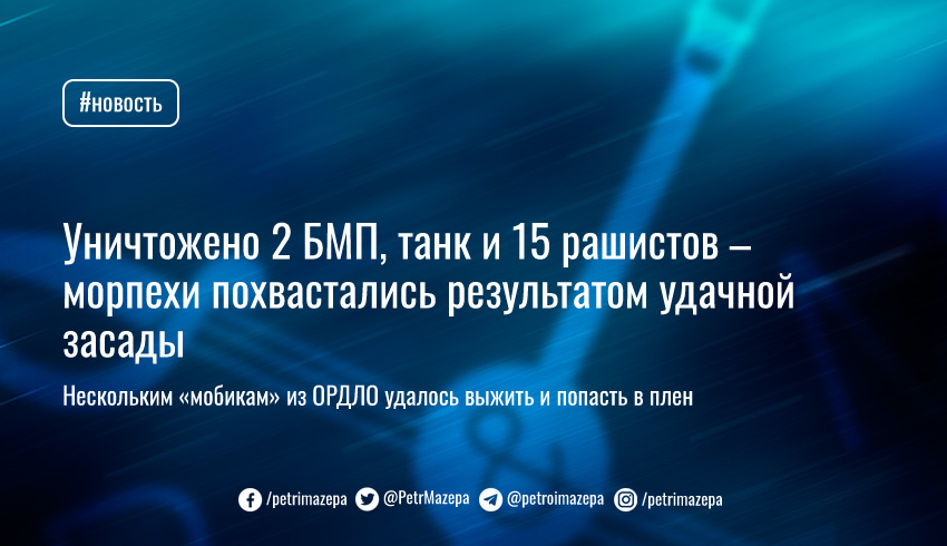 «На Донецком направлении морские пехотинцы устроили засаду, в результате чего уничтожили 2 БМП-2, 1 танк, 15 человек живой силы и взяли 3 пленных», — пишет пресс-служба ВМС ВСУ.