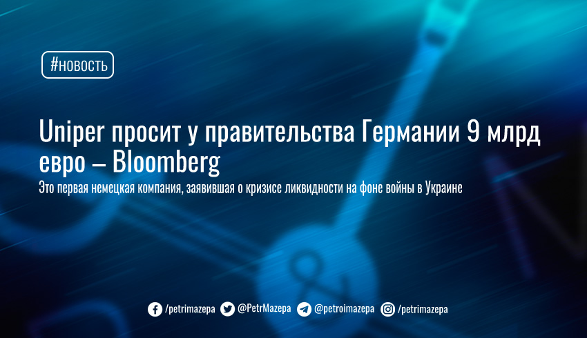 По данным Bloomberg, речь идет о 9 млрд евро. Uniper стала первой немецкой компанией, заявившей о кризисе ликвидности на фоне войны в Украине. Проблемы Uniper связаны со стремительным увеличением цены на газ и сокращением объемов поставок из россии. По оценкам экспертов, компания ежедневно теряет 30 млн евро.