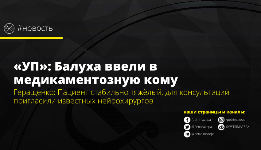 Нардеп Ирина Геращенко же поделилась новостями от лечащих врачей Балуха – она не упоминает про медикаментозную кому, но подчеркивает, что пациент в стабильно тяжелом состоянии, и что его осмотрели известные нейрохирурги в том числе профессор Николай Полищук.