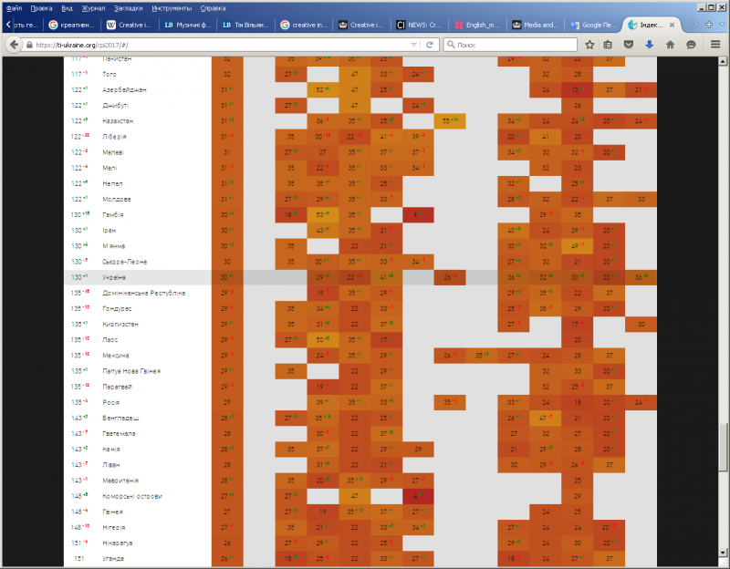 И, обожемой, что мы видим? Представляете, из максимальных 100 баллов у Украины 30, наравне с такими странами, как Гамбия, Сьерра-Леоне, Иран, Мьянма. Хотя это вы и так знаете от наших антикоррупционеров. Эти страны занимают 130 место в общемировом рейтинге. А вот Мексика очень-очень близко: имеет 29 баллов, и занимает 135 место наравне с Доминиканской Республикой, Гондурасом, Кыргызстаном, Лаосом, Папуа Новой Гвинеей, Парагваем и Свинособакией.