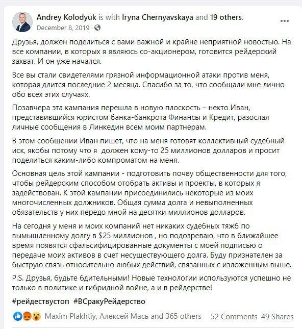 В декабре 2019 года украинский бизнесмен Андрей Колодюк написал в Facebook о том, что у него пытаются обманным путём отобрать бизнес. Кто это хочет сделать и как юридически можно отобрать зарубежные активы, он в своей публикации не рассказал.