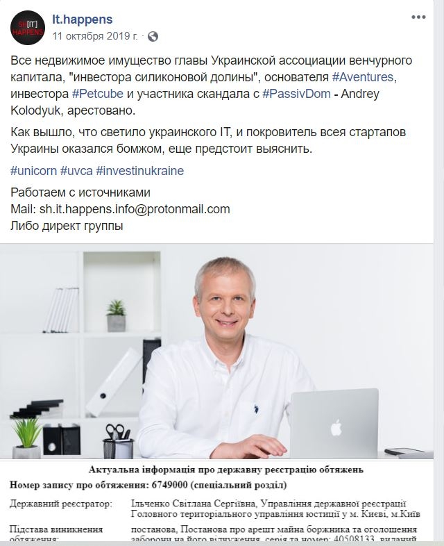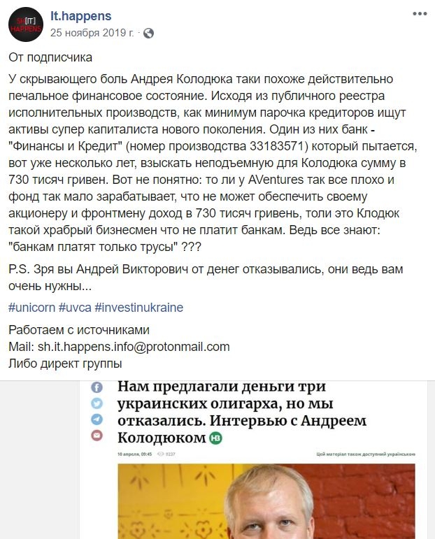 Осенью 2019 года в анонимной Facebook-группе It.happens вышло сразу две публикации про Андрея Колодюка. В одной утверждалось, что всё недвижимое имущество предпринимателя арестовано, а во второй — что он должен банку «Финансы и кредит» 730 тыс. грн.