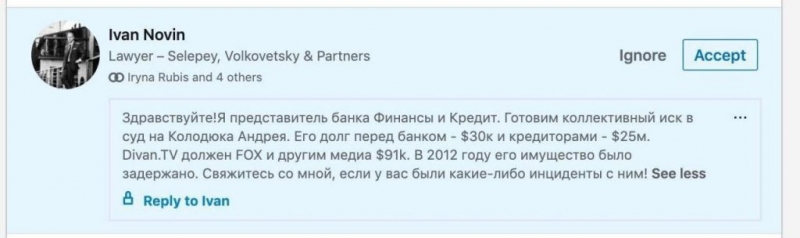 По информации Андрея, человек, подписанный в LinkedIn как Ivan Novin и представляющийся сотрудником банка «Финансы и кредит», рассылает его друзьям и партнёрам сообщения. В них он утверждает, что Колодюк должен разным людям суммарно $25 млн, и предлагает присоединиться к коллективному иску против Андрея.