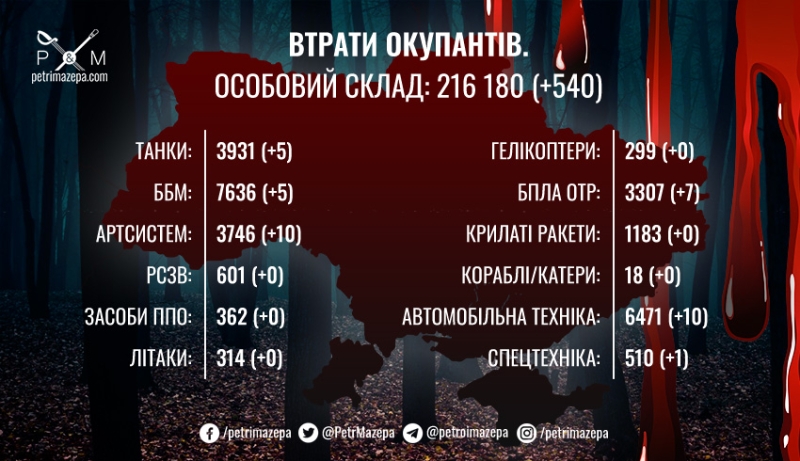 - на Запорожском и Херсонском — противник пытается обороняться. Нанес авиаудары в районах Новоберислава и Казацкого Херсонской области. Под артобстрелами 4 н.п. Донецкой области, 9 н.п. Запорожской области, Херсон, а также Очаков на Николаевщине.