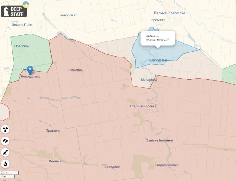 Также вчера было освобождено село Нескучное к северу от Благодатного. А вечером заместитель министра обороны Анна Маляр написала, что деоккупирован также н.п. Макаровка, а в целом на юге наши защитники продвинулись местами на 1500 метров. А на направлениях, где наши войска в обороне, не потеряно ни одной позиции. По данным DeepState, в Макаровке еще проходят стабилизационные действия, поэтому н.п. в серой зоне.