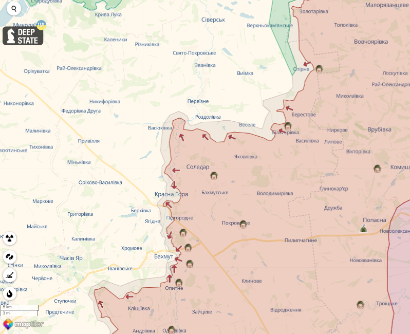 Как сообщает DeepState, на Бахмутском направлении враг захватил село Сакко и Ванцетти (к северу от Соледара), идут бои у того же села. Южнее Бахмута враг атакует из Клещиевки в сторону Ивановского (враг пытается перерезать уже простреливаемую трассу Т0504). В Бахмуте враг пытается прорваться к мясокомбинату и захватил завод шампанских вин. На Авдеевском направлении — без изменений. Ситуация в Авдеевке, Марьинке и Угледаре контролируется.