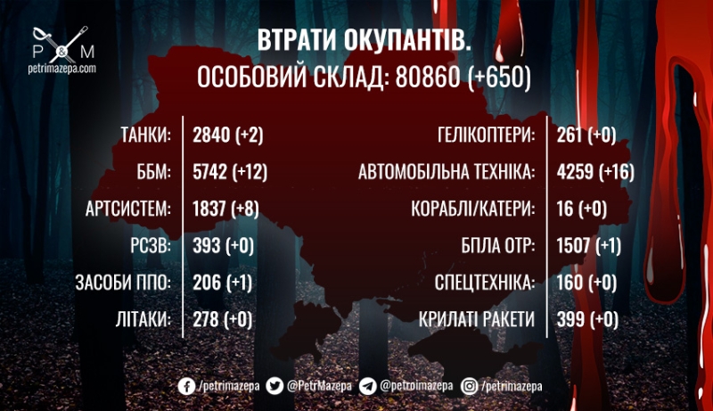 Потери врага уже составили 80860 человек, за сутки враг потерял 2 танка, 12 боевых бронированных машин, 16 автомобилей и автоцистерн, 8 артсистем, 1 средство ПВО и 1 БПЛА оперативно-тактического уровня.