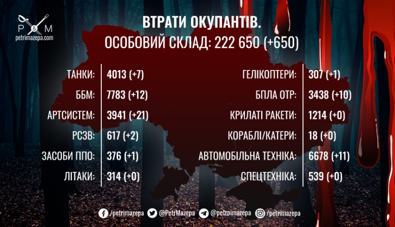 Авиация сил обороны за минувшие сутки нанесла 12 ударов по районам сосредоточения личного состава противника и 6 — по ЗРК врага. Также наши защитники уничтожили российский ударный вертолет Ми-24 и 7 разведывательных БПЛА. Подразделения ракетных войск и артиллерии в течение суток поразили 3 пункта управления, 1 ЗРК, 2 района сосредоточения личного состава и военной техники противника, 13 артиллерийских средств на огневых позициях, 2 станции РЭБ и склад боеприпасов врага.
