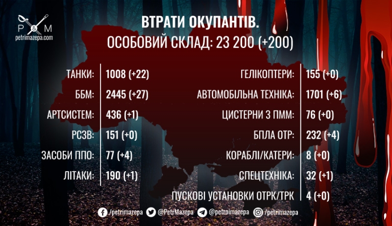 Начались шестьдесят шестые сутки героического противостояния украинского народа российскому военному вторжению. Продолжаются атаки противника в Восточной операционной зоне с целью установления полного контроля над территорией Донецкой и Луганской областей и сухопутного коридора во временно оккупированный Крым.