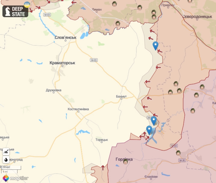 На Краматорском направлении враг бил по окрестностям Краматорска, Северска, Григорьевки, Звановки и Спорного. Рашисты продолжают попытку продвинуться вблизи Ивано-Дарьевки (верхняя точка на карте), бои идут.