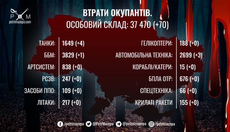 Обновленные данные Генштаба по потерям противника. Пожалуй, самые небольшие за несколько месяцев. Видимо, все зачаровано смотрели на бавовны. Звание самого активного в этот раз досталось Николаевскому направлению.