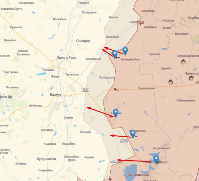 На Бахмутском направлении враг пытается улучшить тактическое положение. Но попытка продвинуться ближе к Соледару по направлениям Владимировка и Стряповка (две верхние стрелки на карте) завершилась для оккупантов провалом. Штурмовые действия на направлениях Клиново — Бахмут (третья сверху стрелка) и Мироновский — Семигорье (нижняя стрелка) наши воины отразили и вынудили оккупантов отступить. На направлении Возрождение — Вершина (вторая снизу стрелка) противник имеет частичный успех, закрепляется юго-восточнее н.п. Вершина. Также противник массово совершил артиллерийские обстрелы и авиаудары.