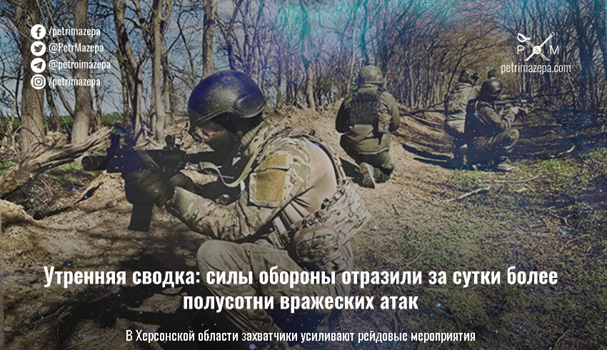 За прошедшие сутки противник нанес 4 ракетных и 40 авиационных ударов, совершил 58 обстрелов из реактивных систем залпового огня по позициям наших войск и гражданской инфраструктуре населенных пунктов. По данным Генштаба ВСУ, за минувшие сутки украинские защитники отразили более 50 атак россиян. На оккупированных территориях Херсонской области захватчики усиливают рейдовые мероприятия.
