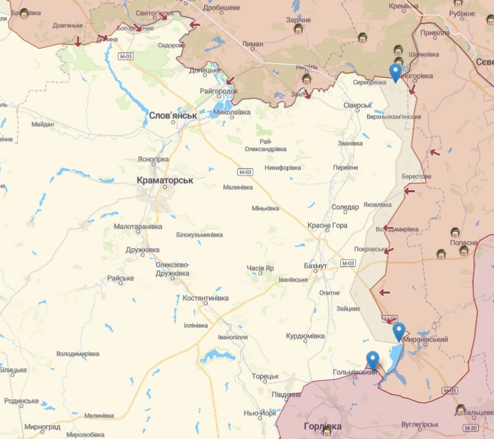 На Краматорском направлении противник обстрелял гражданскую инфраструктуру в районах Григоровки, Верхнекаменского и Краматорска. Штурмовыми действиями пытается продвинуться в районе н.п. Григоровка (верхняя точка на карте), бои продолжаются.