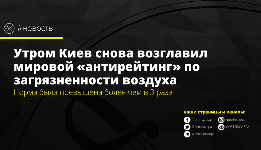 Сегодня утром украинская столица снова возглавила «антирейтинг» городов с самым загрязненным воздухом. Ситуация улучшилась только к 10:00, однако Киев опустился всего лишь на 4 место, обогнав даже Шанхай.
