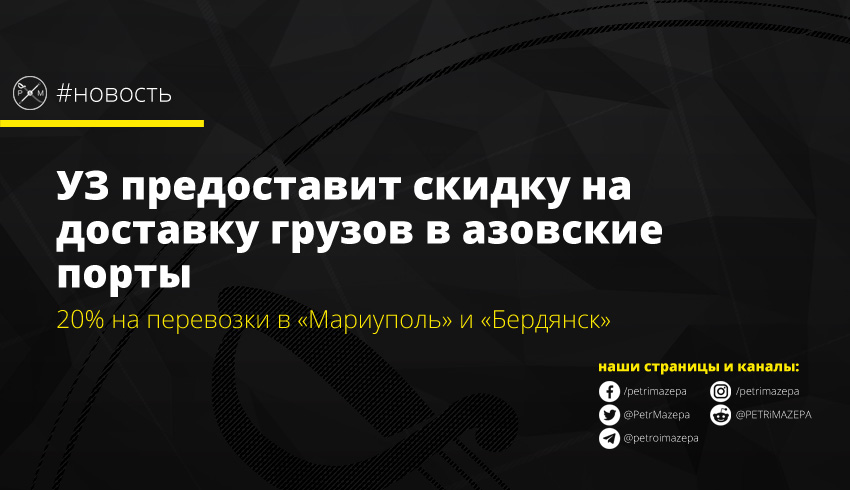 «Укрзалізниця» согласовала предоставление 20% скидки на тарифы железнодорожной доставки грузов, которые следуют в азовские морские порты «Мариуполь» и «Бердянск». Ожидается, что это поможет в организации бесперебойной работы портов, на которую негативно повлияли противоправные действия, принимаемые страной-агрессором в Азовском бассейне.
