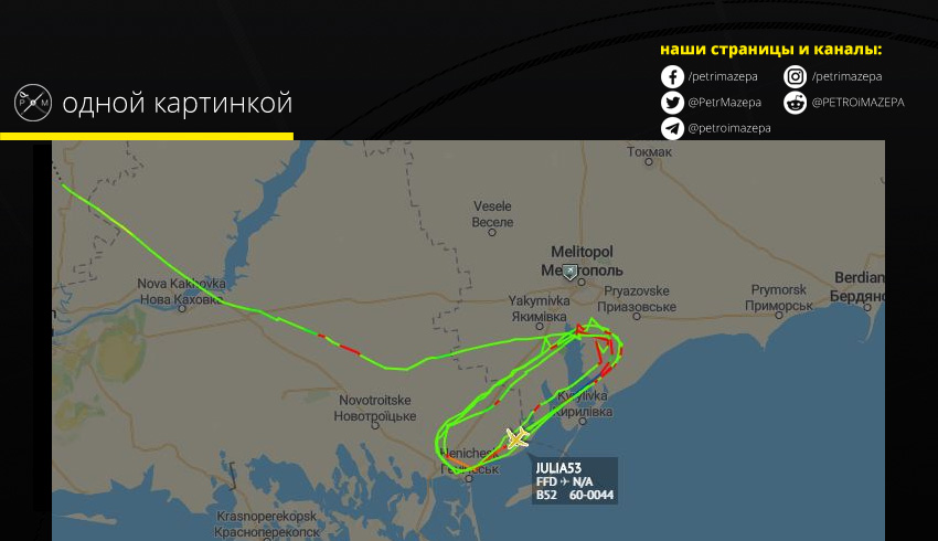Сегодня утром бомбардировщики с бортовыми номерами JULIA51/61-0034 и JULIA53/60-0044 залетели на территорию Украины из Польши. К 14:00 они сделали уже долетели до админграницы с Крымом и начали нарезать круги между Мелитополем и Геническом в Запорожской области, передает «Український мілітарний портал».
