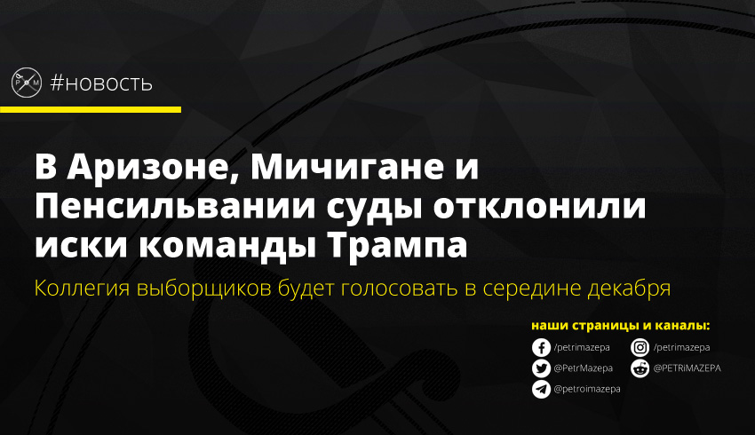 На этой неделе в ряде штатов США суды отклонили иски команды Дональда Трампа относительно пересчета голосов или признания части бюллетеней недействительными. У Трампа заявляют, что борьба еще не окончена и есть другие иски с «реально заслуживающими доверия утверждениями» о нарушениях. Сейчас суды отклоняют иски, в которых нет достаточных обоснований, чтобы успеть разобраться со всем избирательным процессом до середины декабря, когда выборщики соберутся на голосование за нового президента.