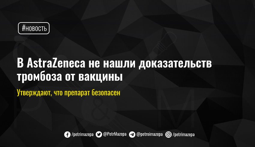 В заявлении, обнародованном на официальном сайте AstraZeneca, сообщают, что имеющимся данным, нет подтверждений касательно того, что вакцина компании стала причиной образования тромбов у привитых.