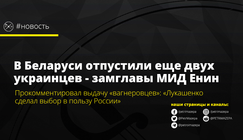 Замминистра иностранных дел Евгений Енин рассказал о том, что на свободу в Беларуси вышло еще двое граждан Украины. Таким образом, количество освобожденных украинцев достигло 5 человек. Кроме того, замминистра прокомментировал выдачу боевиков ЧВК «Вагнер» РФ.