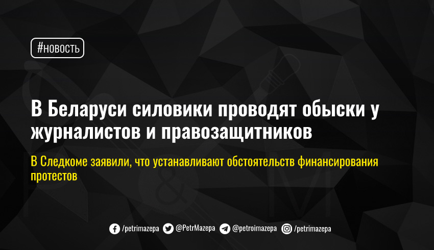 В следственных мероприятиях участвуют сотрудники отделов по борьбе с организованной преступностью (ГУБОПиК). Следственный комитет сообщил, что обыски проводятся «с целью установления обстоятельств финансирования протестной деятельности» в Беларуси в рамках расследования уголовного дела по ст.342 УК (организация и подготовка действий, грубо нарушающих общественный порядок, либо активное участие в них).