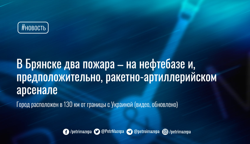 В российском Брянске около двух ночи начались два крупных пожара. Официально сообщали сначала только об одном — в нефтехранилище. По неофициальным данным, второе ЧП — это горит 120-й арсенал Главного ракетно-артиллерийского управления. После появления информации российский «Интерфакс» стал также неофициально утверждать, что горят все-таки «два хранилища нефтепродуктов».