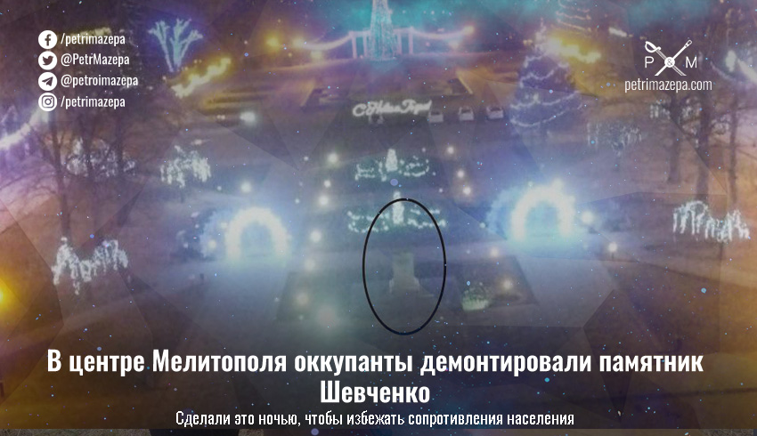 «Вчера поздно вечером, в комендантское время в самом сердце города демонтировали памятник Тарасу Шевченко. Видимо, на подвал забрали, ведь только так и могут расправляться с неугодными», — отметил мэр города Иван Федоров в Telegram.