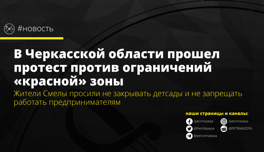 В городе Смела, Черкасская область, прошел протест против внедрения в городе карантинных ограничений, предусмотренных «красной» зоной карантина. Местные жители требовали не закрывать детские сады, а также не мешать работать предпринимателям.