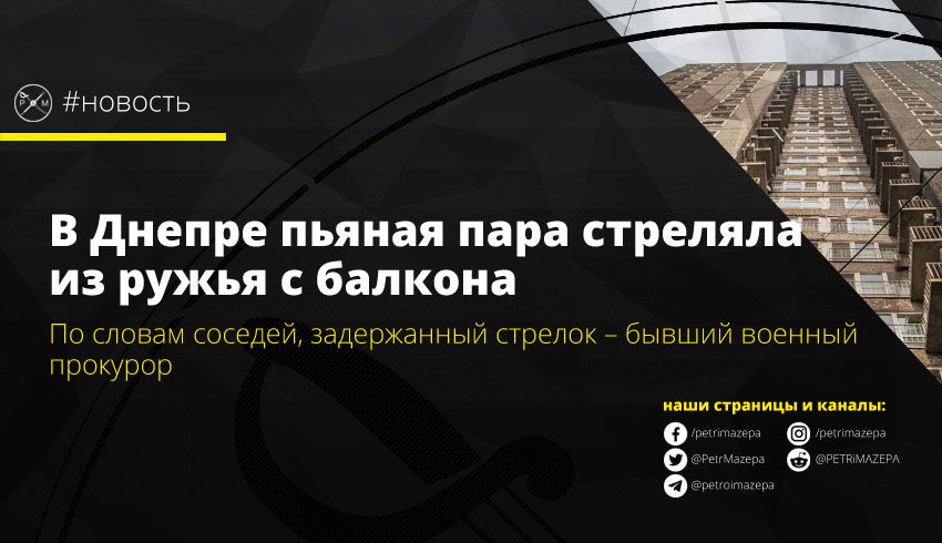 В Днепре полиция задержала мужчину и женщину, которые стреляли из ружья с балкона своей квартиры. Стрелки находились в состоянии алкогольного опьянения, и были доставлены в отделение полиции, изъято зарегистрированное охотничье ружье. Как сообщают СМИ, соседи и очевидцы называют стрелка бывшим военным прокурором.