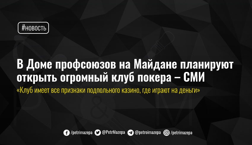 В Доме профсоюзов на Майдане, где во время пожара в 2014 году погибли два человека, планируется открыть клуб спортивного покера на более чем тысячу квадратных метров, сообщает «Слідство.Інфо». Издание подчеркивает, что этот клуб имеет все признаки подпольного казино, где будут играть на деньги.