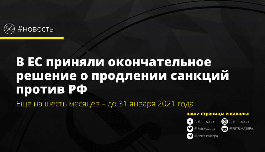 Европейский Союз принял окончательное решение о продлении санкций против РФ еще на полгода — до 31 января 2021 года. Соответствующее решение было принято сегодня Советом Европейского Союза.