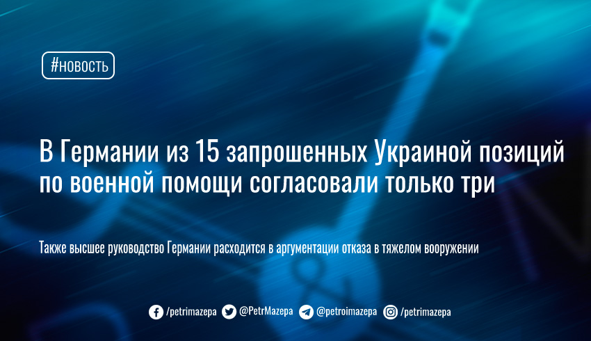Министерство обороны Германии по требованию канцелярии изъяло все тяжелое вооружение из списка предоставленных Украиной запросов. Оставили только три позиции из 15, хотя немецкая промышленность готова его поставить почти все в кратко- и среднесрочной перспективе. В то же время в Минобороны Германии говорят, что ведут переговоры со странами ЕС и НАТО, которые могут предоставить Украине тяжелые вооружения советского производства.