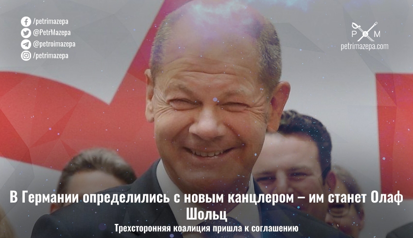 Лидер Социал-демократической партии Германии (СДПГ) Олаф Шольц сменит Ангелу Меркель на посту федерального канцлера Германии. Трехсторонняя коалиция сегодня пришла к соглашению. Его планируют публично представить сегодня, но позднее.