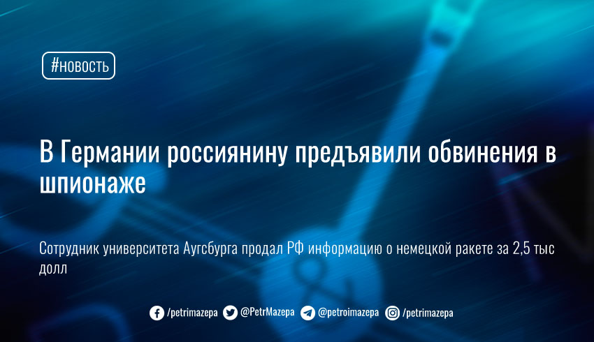 В Германии предъявили обвинения в шпионаже бывшему сотруднику университета Аугсбурга – россиянину, продавшему данные об исследованиях в аэрокосмической сфере стране-агрессору. За всю информацию обвиняемый по данным следствия получил около 2,5 тыс долл.