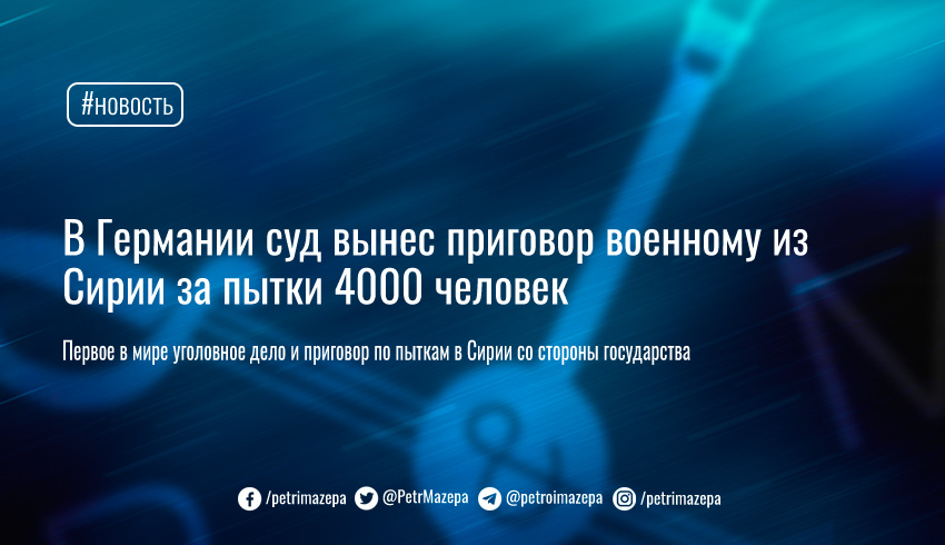 Суд в Германии признал бывшего сирийского полковника Анвара Раслана виновным по обвинению в государственных пытках. За процесс убийства 27 человек в центре содержания под стражей Аль-Хатиб в Дамаске его приговорили к пожизненному заключению. Средство предполагает, что он несет ответственность за пытки не менее 4000 человек в тюрьме Службы общей разведки. Подсудимого обвинили в надзоре за допросами, в том числе «электрошоке», избиении «кулаками, проводами и плетками», изнасиловании и сексуальном насилии, а также лишении сна.