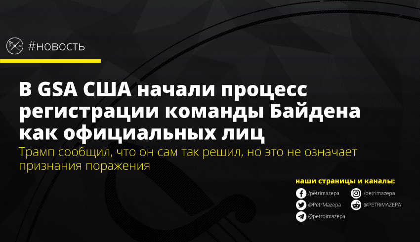 Глава федерального Управления служб общего назначения США (GSA) направила команде Джо Байдена письмо, которое в Вашингтоне расценили как первое свидетельство того, что администрация США все же готова признать победу Джо Байдена. Глава подчеркнула, что на ее решение не давили ни с одной из сторон, но позднее Трамп написал, что это он так посоветовал поступить Эмили Мерфи.