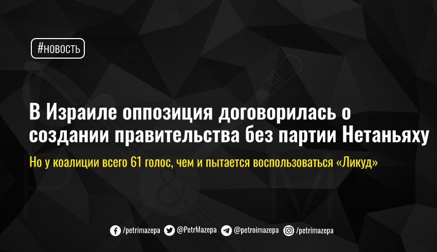 Израильские оппозиционные партии договорились о формировании нового коалиционного правительства без участия партии «Ликуд» действующего премьер-министра Биньямина Нетаньяху. Но наскребли ровно 61 подпись (из 120 членов Кнессета), поэтому «Ликуд» старается максимально отсрочить голосование за новую коалицию, чтобы уговорить хотя бы 1-2 депутатов и развалить наметившуюся коалицию, которую называют «левой».