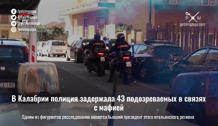 В итальянском регионе Калабрия во вторник, 27 июня, полиция задержала 43 человека, которых связывают с мафиозной группировкой «Ндрангета». Одним из фигурантов этого расследования является бывший президент Калабрии 70-летний Марио Оливерио, избранный от Демократической партии.