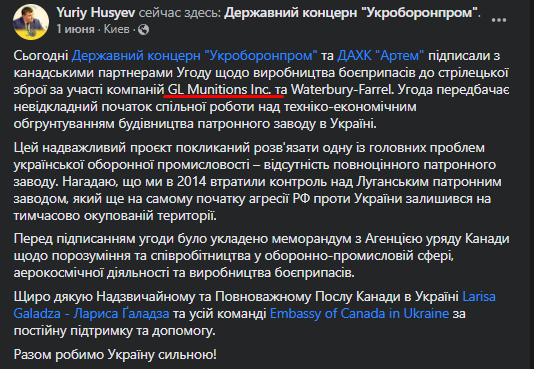 В июне генеральный директор концерна «Укроборонпром» Юрий Гусев заявил, что подписан меморандум с канадскими компаниями GL Munitions Inc. и Waterbury-Farrel. И целью этого меморандума является строительство в Украине патронного завода.