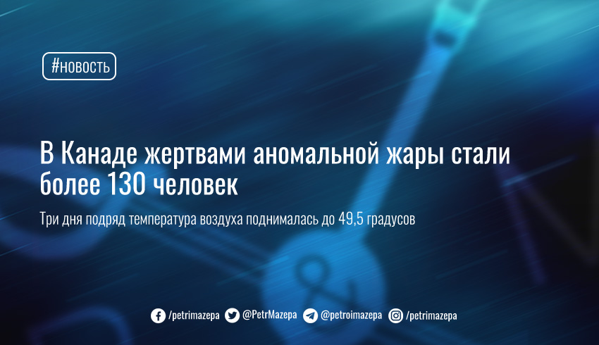 Аномальная жара стала причиной смерти более 130 человек в городах провинции Британская Колумбия в Канаде. По данным СМИ, большинство из умерших были пожилыми людьми или имели основные заболевания.