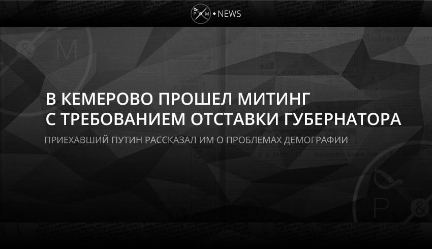 Жители Кемерово вышли на митинг, требуя провести прозрачное расследование трагедии в ТРЦ «Зимняя вишня», привлечь к ответу виновных и отправить в отставку губернатора региона и чиновников городской администрации. Путин тем временем посетил пострадавших при пожаре и призвал остальных не верить не официальной информации о количестве погибших.