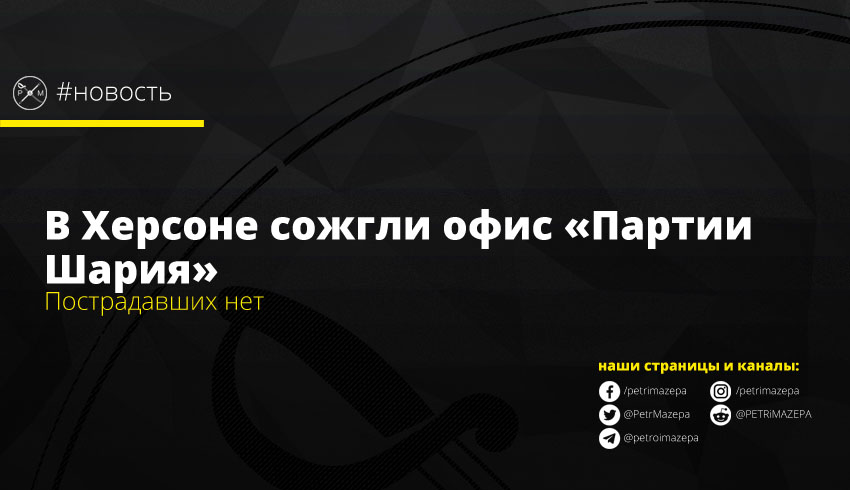 В Херсоне неизвестный ночью поджег офис «Партии Шария». Пожар был ликвидирован оперативно, пострадавших нет, Нацполиция открыла дело по статье об умышленном уничтожении имущества, а Шарий вспомнил про Зеленского, траур, и пообещал пожарным денег.