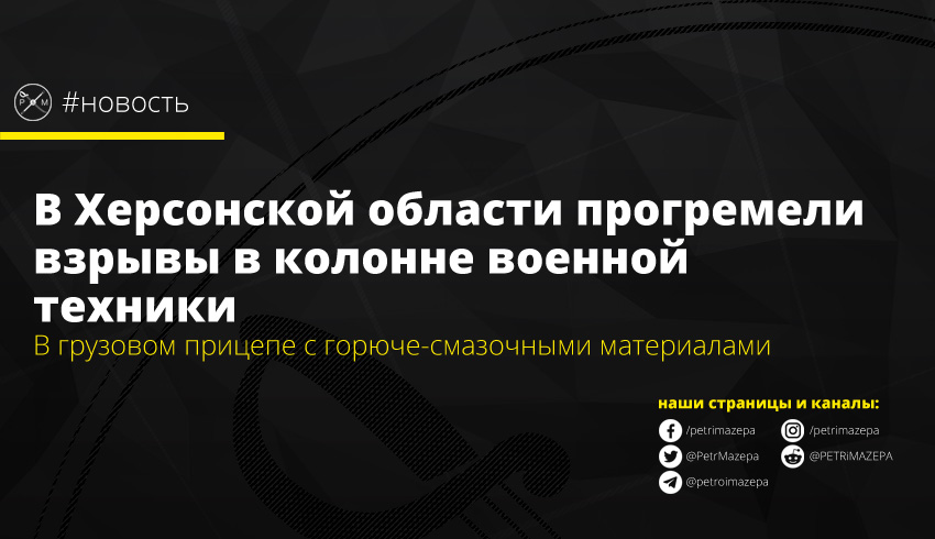 В Херсонской области во время движения колонны военной техники взорвался грузовой прицеп, в котором перевозили горюче-смазочные материалы. Кроме горюче-смазочных материалов, в прицепе перевозили элементы защитной динамической брони (защитного снаряжения, конструкция которого может включать взрывчатку). Обошлось без пострадавших.