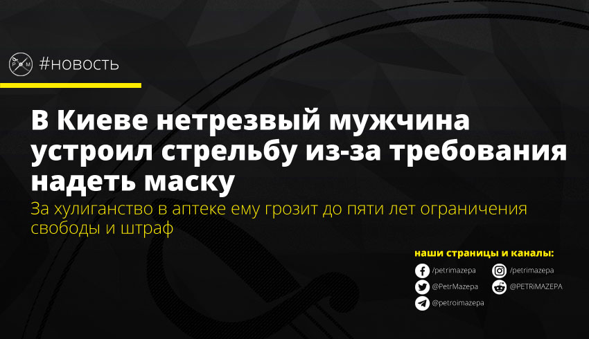 В Киеве нетрезвый посетитель устроил стрельбу у аптеки, из которой был выдворен за отказ надеть маску. Полиция задержала правонарушителя, на него составлен протокол по ч. 2 ст. 44-3 о нарушении правил карантина, и открыто уголовное дело по ч. 1 ст. 296 о хулиганстве.