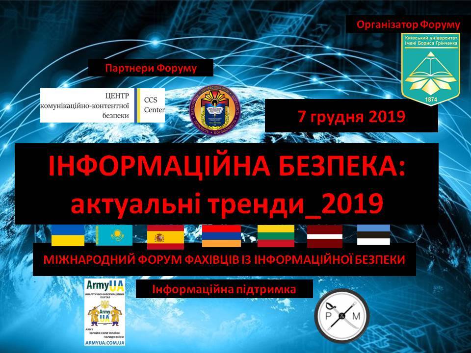 В Киеве 7 декабря пройдет международный форум «ИНФОРМАЦИОННАЯ БЕЗОПАСНОСТЬ: актуальные тренды_2019», на котором обсудят не только вопросы гибридных конфликтов, но и региональной безопасности, и информационных технологий. В рамках форума пройдет дискуссия, посвященная трендам уходящего года и перспективам информбезопасности в 2020 году.