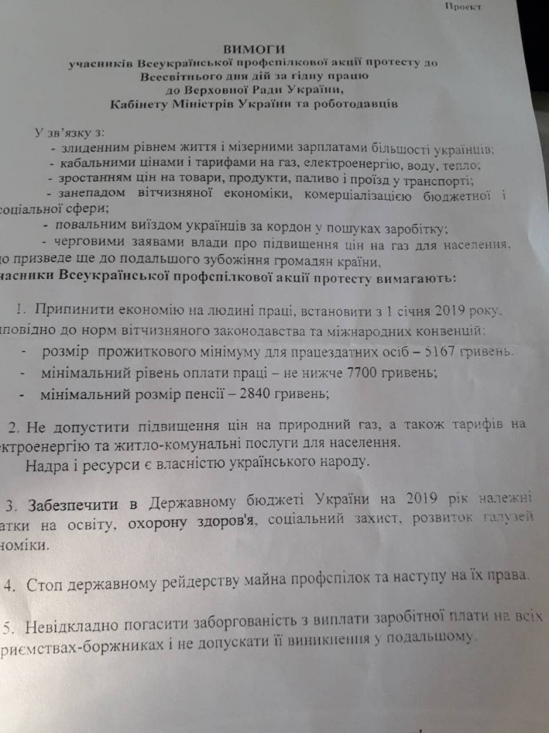 Согласно появившемуся в сети снимку проекта требований, желаемый уровень минимальной зарплаты уже с 2019 года составляет 7700 грн, пенсии – 2840 грн, а прожиточный минимум с точки зрения профсоюзов должен составлять 5167 грн. Недовольны протестующие и отъездом сограждан за рубеж и заявлениями о повышении цен на газ, снова обещают «зубожiння».