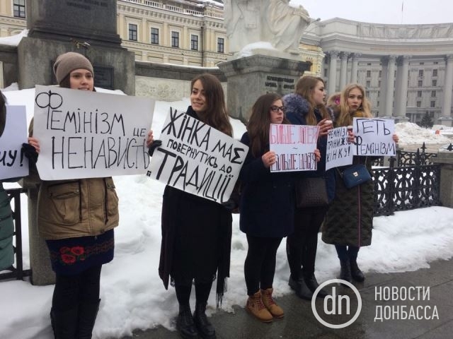 Участницам марша за права женщин решили противопоставить себя пять других женщин, которые стояли под деревом с плакатами «феминизм – это ненависть» и «женщина должна вернуться к традициям».