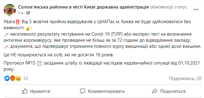 О том, что с 5 октября усиливается карантин в Киеве, сообщила Соломенская районная государственная администрация в Facebook. Они информируют, что прием посетителей старше 18 лет в Центрах предоставления административных услуг Киева не будет осуществляться без наличия негативного результата ПЦР или экспресс-теста, либо сертификата о вакцинации.