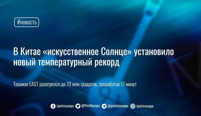 Токамак EAST (Experimental Advanced Superconducting Tokamak) в Китае, известный как «искусственное Солнце», установил новый рекорд устойчиво высоких температур - достиг 70 миллионов градусов по Цельсию, проработав более 17 минут.