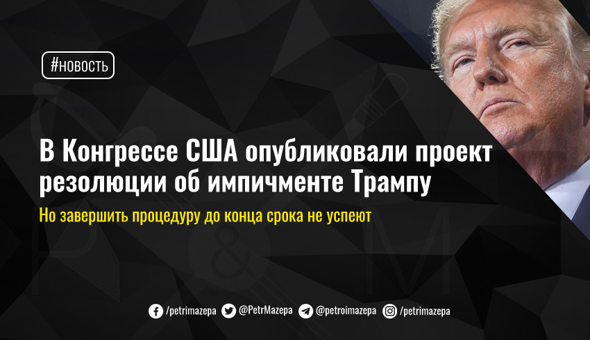 Палата представителей конгресса США опубликовала проект резолюции об импичменте президента Дональда Трампа. По данным СМИ, голосование за этот проект пройдет уже в среду.